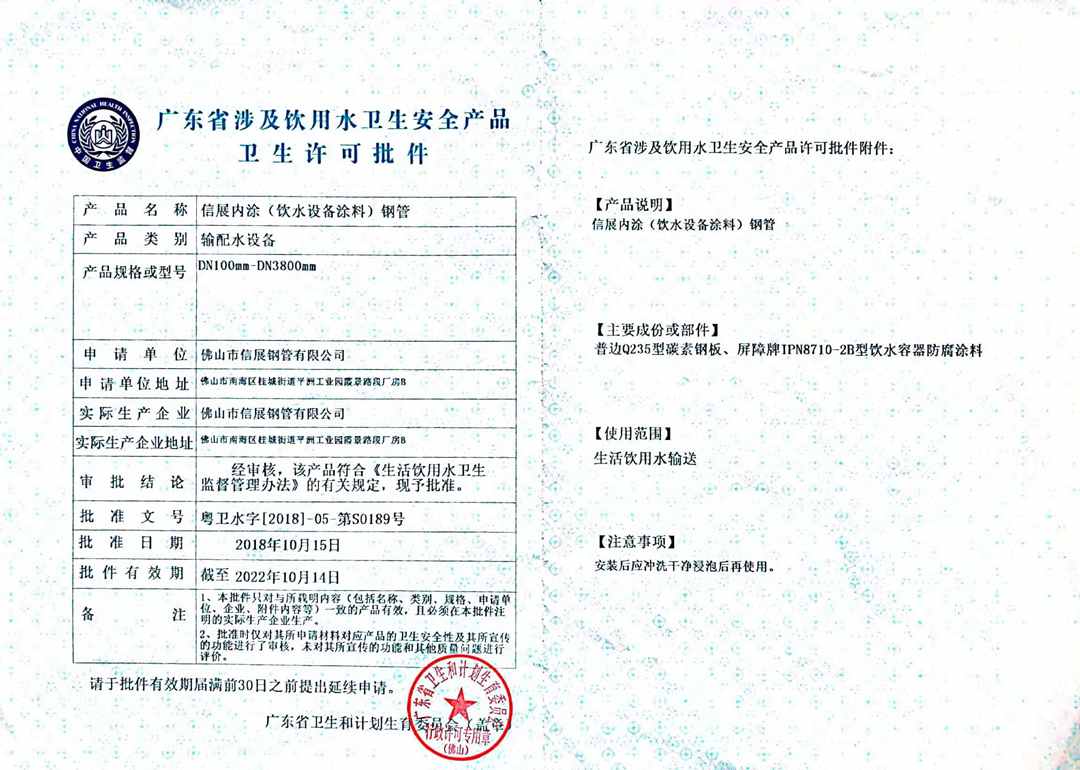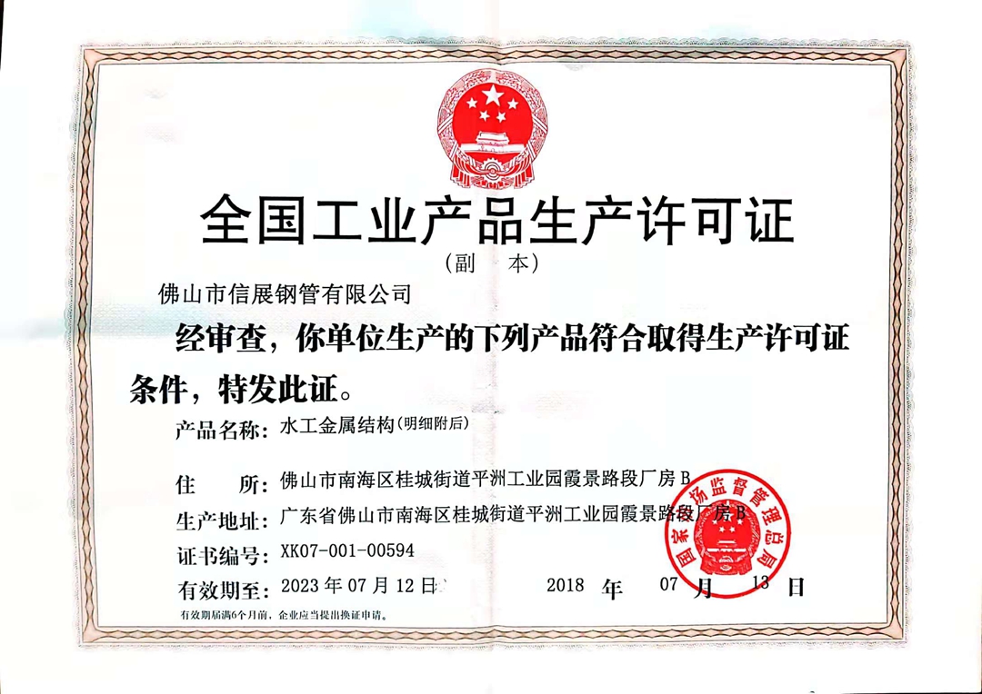 佛山市信展钢管有限公司(原佛山市南海区平洲信展五金厂),成立于1987年4月,坐落于佛山市南海区平洲工业园。 厂区占地面积30000多平方米,建筑面积约20000多平方米。公司现有产品的内、外(环)直焊缝加工全部采用埋弧自动焊接,配有内外防腐生产线,生产能力可达7000吨/月,可批重供应规格为DN300-DN5000、管壁厚度达40MM、工作压力达1.5Mpa以上等各种形式的防腐供排水钢管以及各类弯管、弯头、异径管、三通、四通、压力容器、旋压封头、法兰等管件产品。